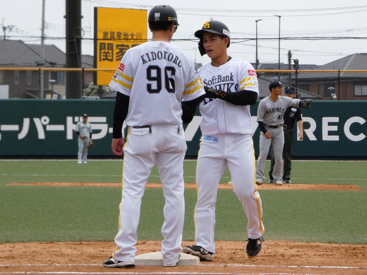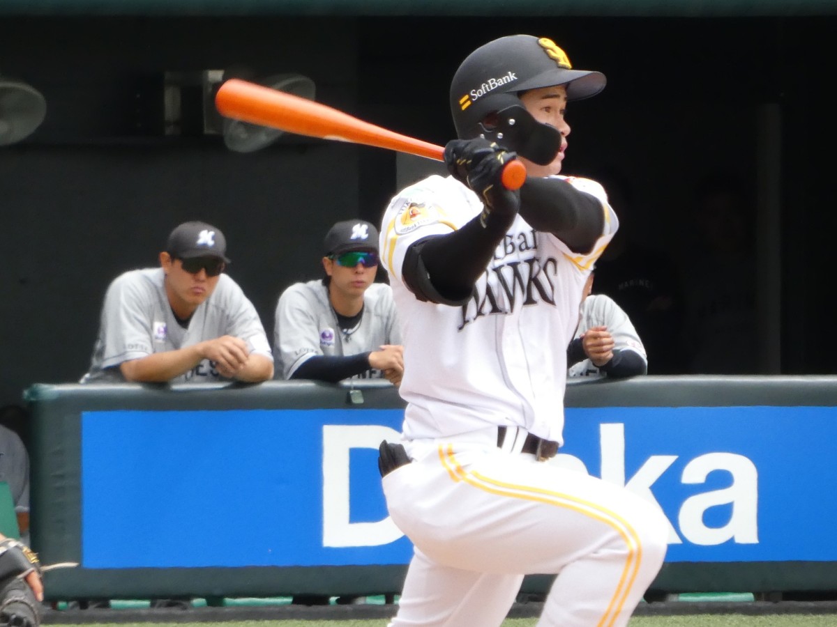 一塁に立つと大きくリードをとり、両足がアンツーカーを出ていました。斉藤和巳2軍監督も「今のうちの2軍選手の中で一番大きくリードをとっている選手」と評価。