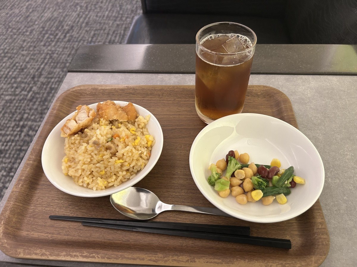 ちなみに、若い頃からJALカードを長年使ってきたことで去年やっとJGC入りを果たすことができ、おかげでチェックインもスムーズに行えて、さらにラウンジまで利用できるという贅沢な旅路に。朝から唐揚げ&チャーハンはなかなかですが、さくっと頂きました(笑)。